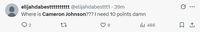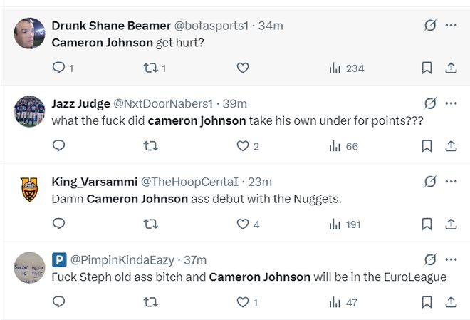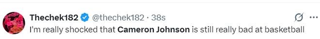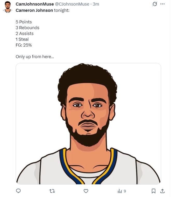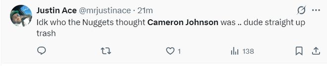 卡梅伦-约翰逊是掘金今夏用小波特+1个首轮签从篮网换来的,都说他是一个顶级的3D锋线,可他季前赛场均20.6分钟,拿到8.2分2.6篮板1.4助攻1抢断,命中率39.4%,三分命中率30.4%。